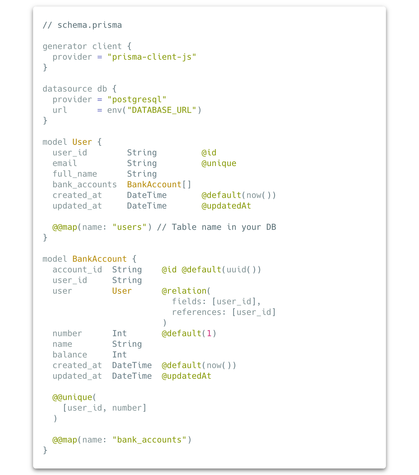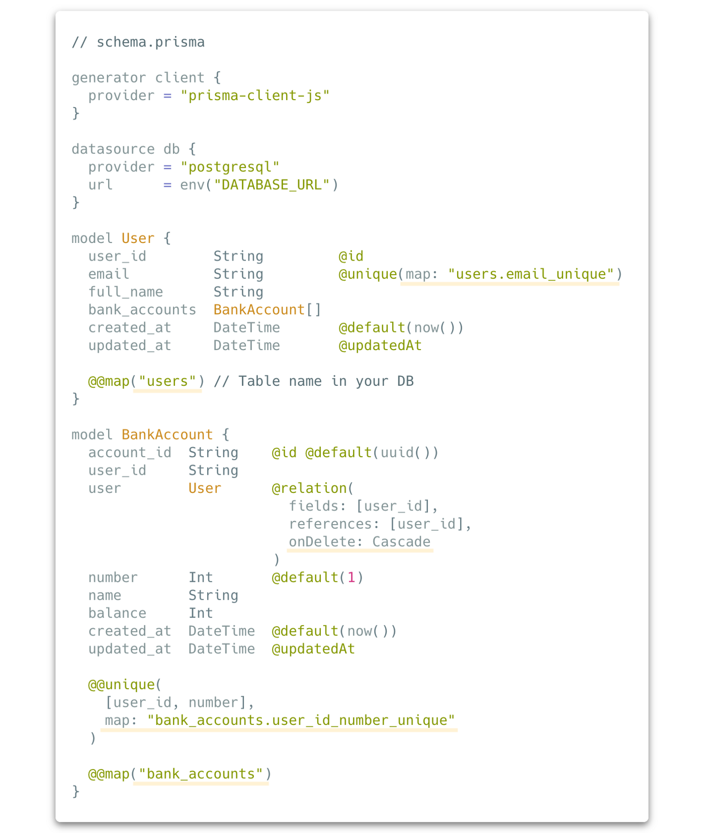 schema.prismatend to generate not-so-easy-to-use TypeScript types. But Prisma team has worked on that when releasing v3 so you’ll have more control on how to name these constraints. - Using enums in your schema can be too much of a constraint compared to defining your enums in your code. Once again that’s a personal tradeoff: more flexibility with enums in JS/TS vs more security with DB-level enums.