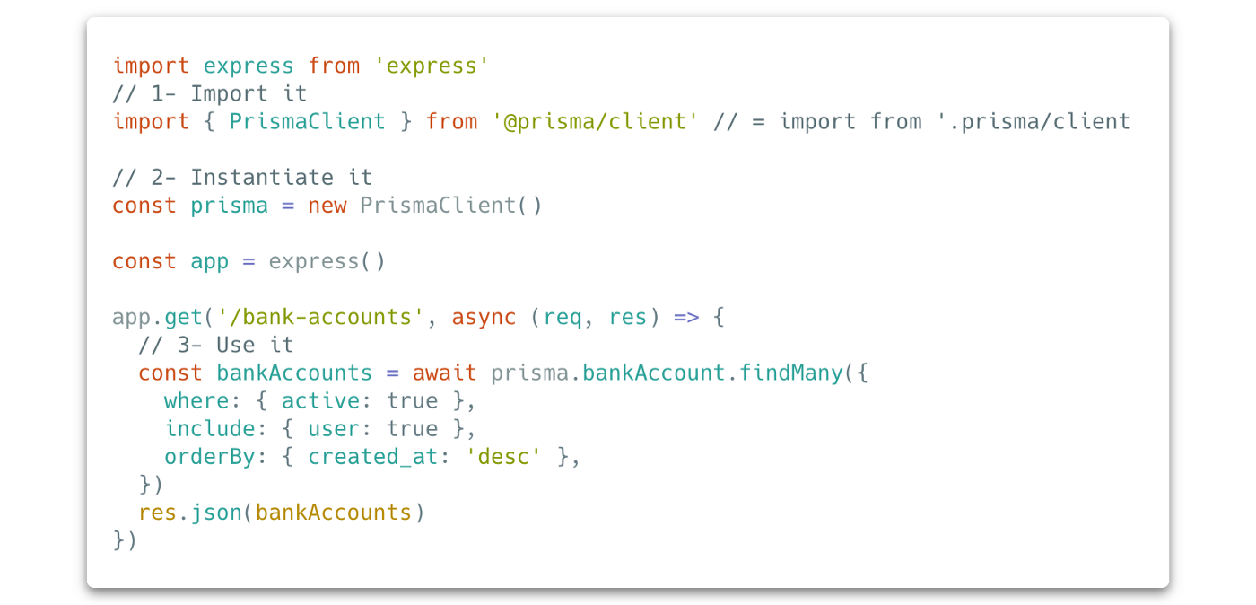 In a more serious project, you might want to instantiate your Prisma client only once and then use dependency injection to pull it wherever you need.