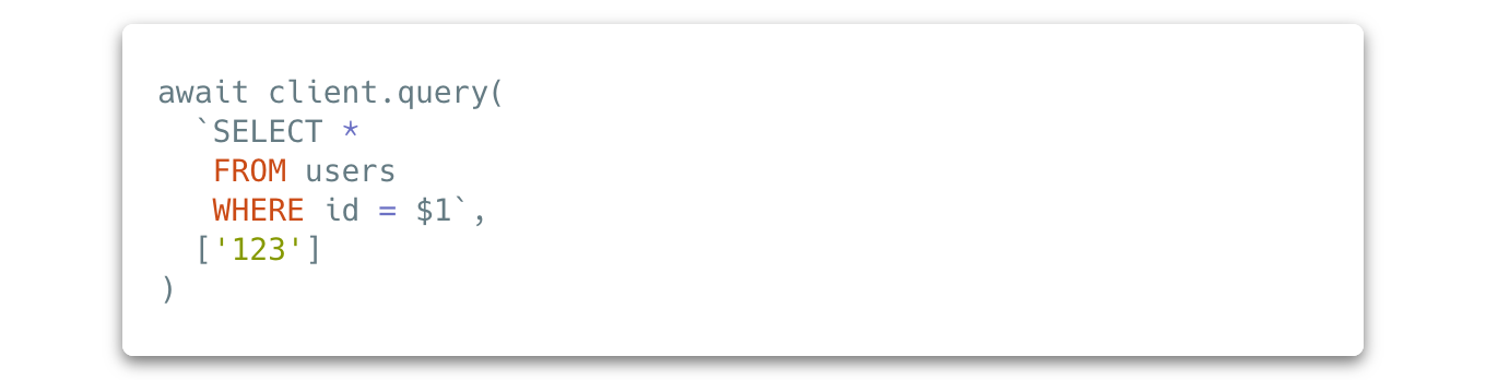 As I’m using PostgreSQL, it would be node-postgres. By choosing this solution, you will be in total control of the SQL sent to your database, and you’ll end up writing your queries like this: