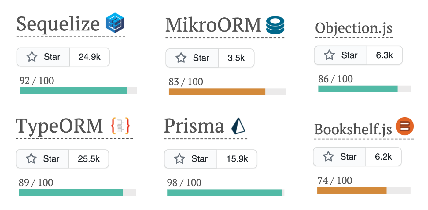 Package scores come from snyk.io (example for Prisma), they take into account a few aspects such as popularity, maintenance, security and community. I don’t know what it’s worth but at least it gives another metric along with Github stars (which is not a real metric, yes you’re right). You can also check moiva.io 📊.