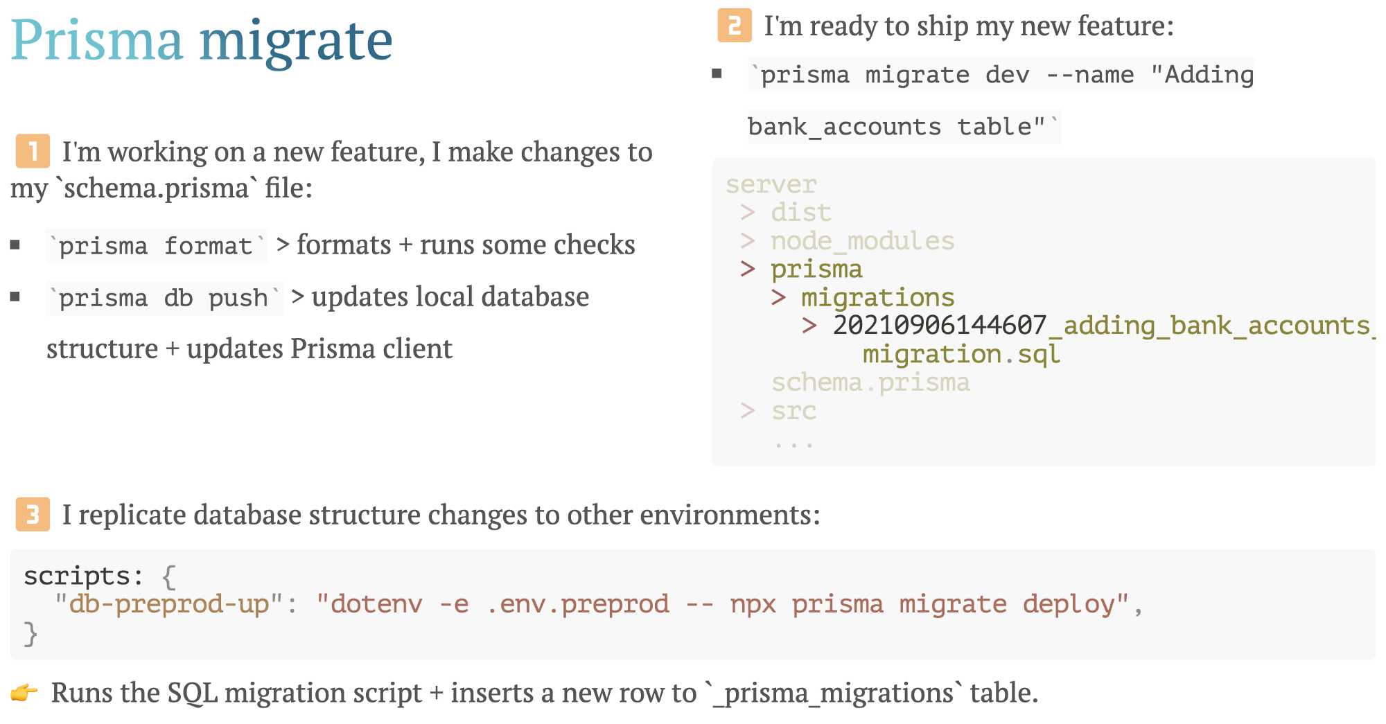 Migrations are one of the big subjects you’ll have to deal with during your development phase. Prisma won’t be your silver bullet, you will still need to gain knowledge about good practices (the expand and contract pattern, “Ensure the new changes work before you drop anything”, etc.), but Prisma CLI does include all necessary commands.