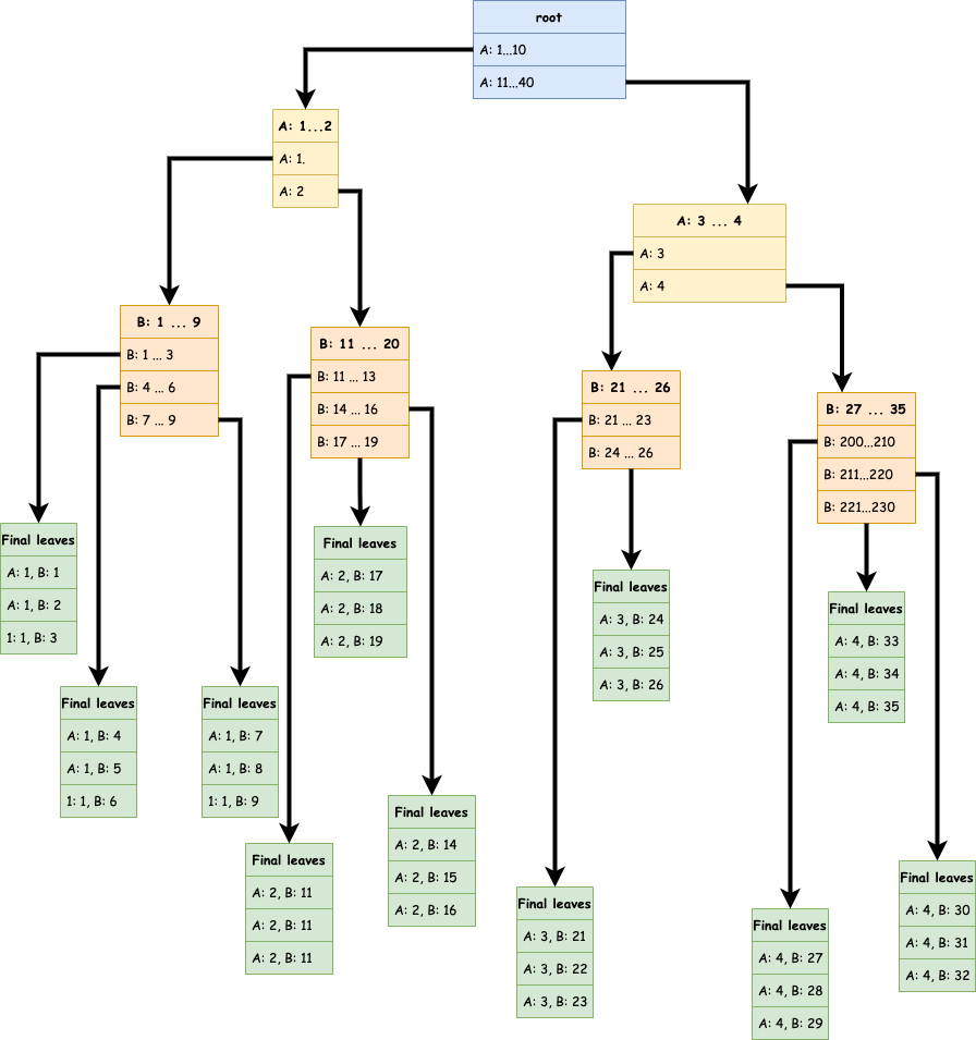 Exemple de schéma si on créé un index B-tree sur les colonnes “A” et “B” (dans cet ordre).