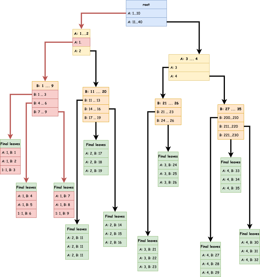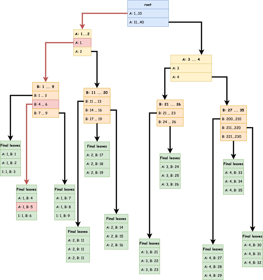 Si maintenant, je veux la valeur A: 1, B: 5 voici le parcours (en rouge) qui va être effectué.