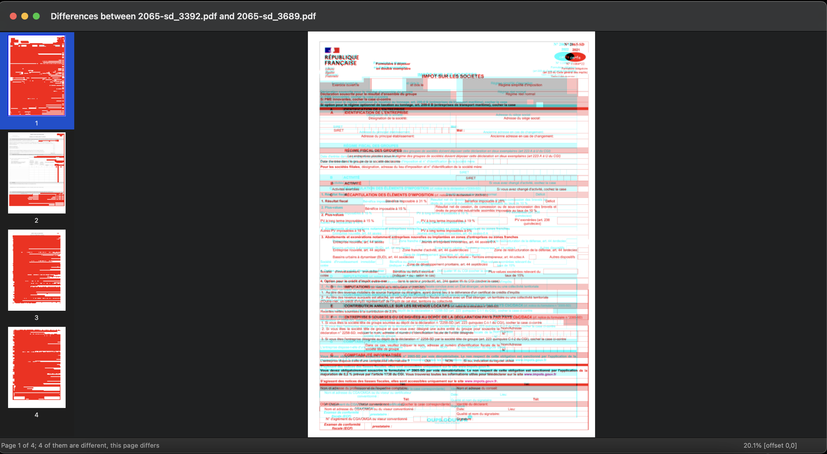 La première difficulté est de voir la différence entre 2 millésimes. Nous utilisons pour ça l'outil diff-pdf (https://vslavik.github.io/diff-pdf/).