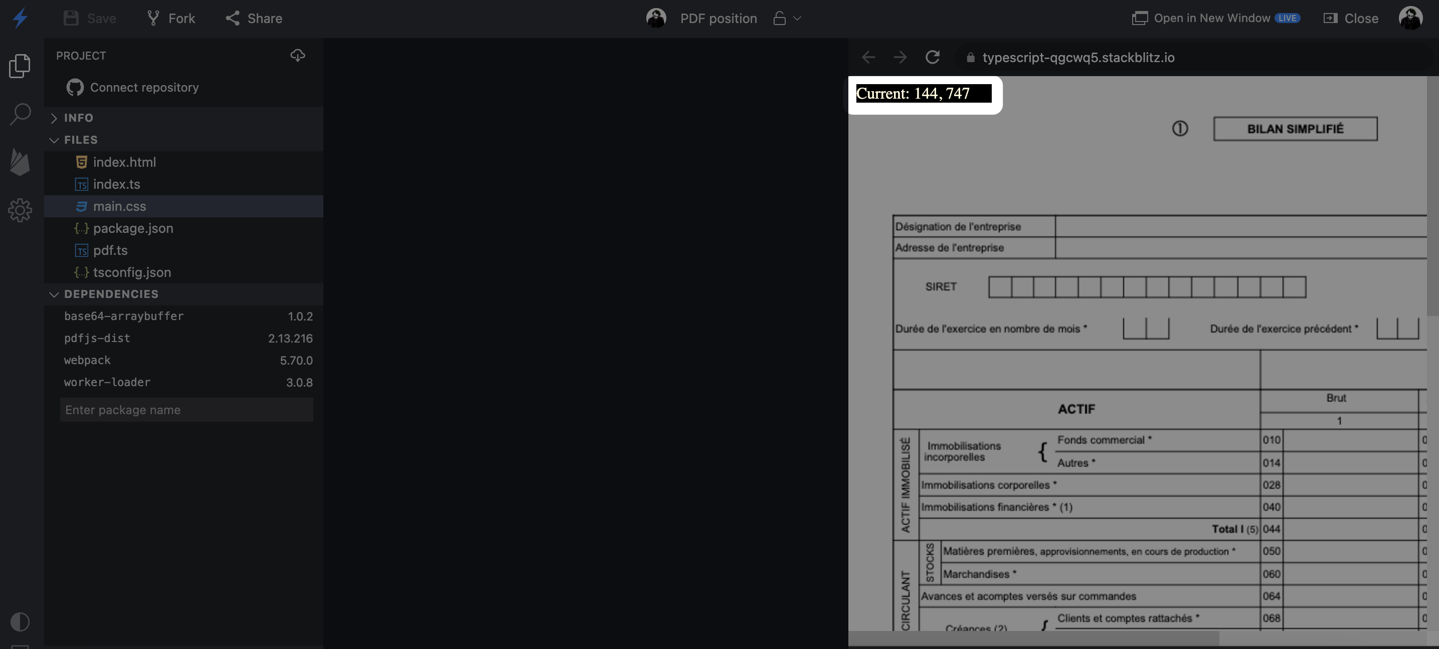 Le point important du code est à la ligne 33 avec viewport.convertToPdfPoint. Cette méthode permet d'avoir les bonnes coordonnées à l'intérieur du pdf. Elle va convertir le x, y du navigateur en coordonnées du pdf.