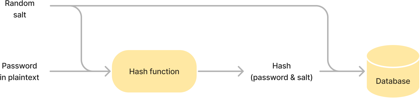 To avoid this, two actions are necessary to store a password securely: hashing and salting.